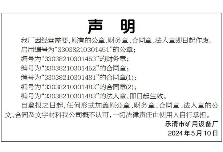 我廠因經營需要,原有的公章、財務章、合同章、法人章即日起作廢。啟用編號為”33038210301451“的公章;編號為”33038210301453“的財務章;編號為”33038210301452“的合同章;編號為”33038210301481“的合同章(1);編號為”33038210301482“的合同章(2);編號為”33038210301483“的法人章,即日起生效。自登報之日···